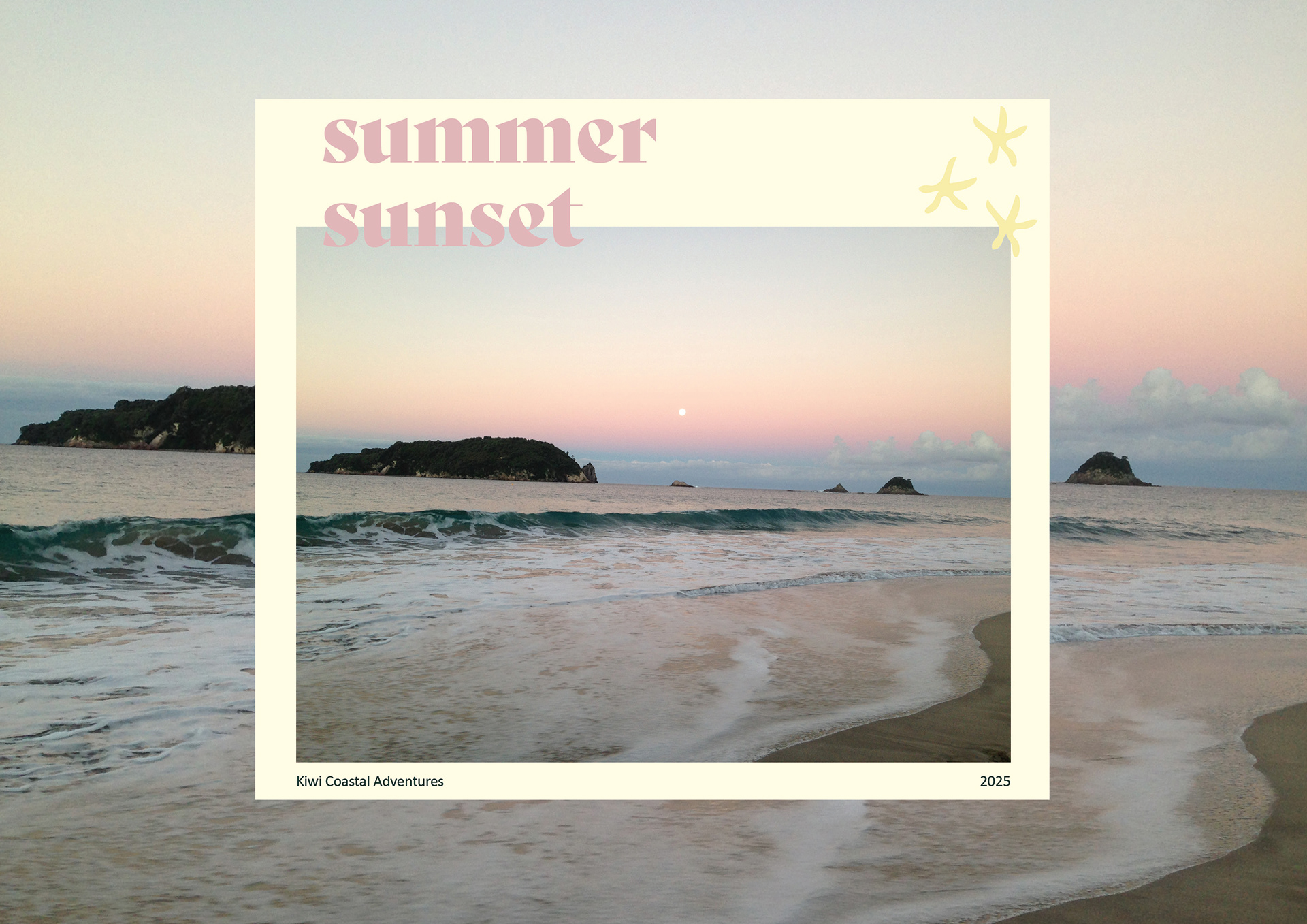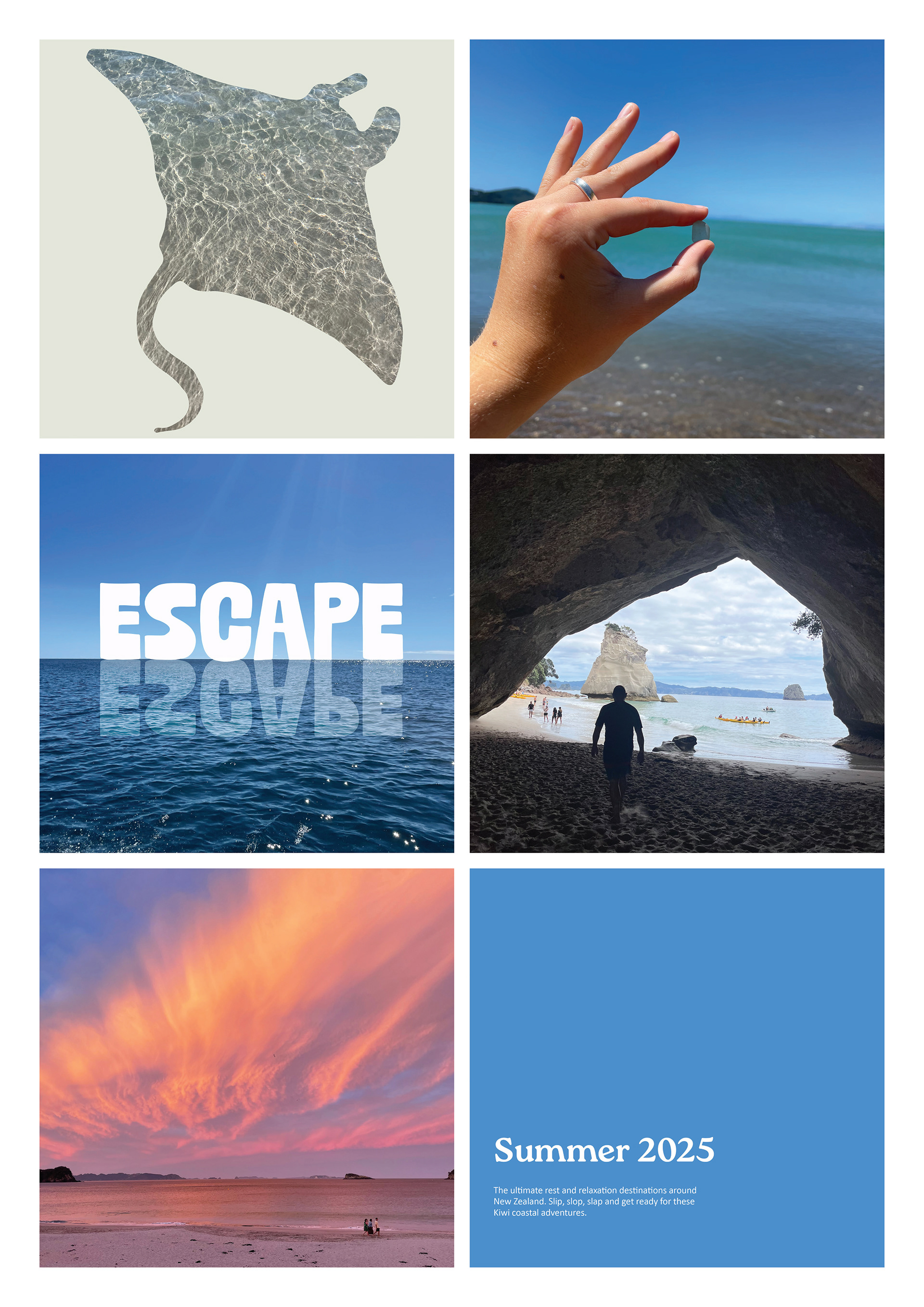 This summer project captures beaches and scenery around New Zealand that I connect to as I wanted to make a project I could have fun with. Using a mix of photography and illustration I aimed to create imagery that felt like you were at the beach just by looking at it. The design to the left could be what an instagram feed could look like. The design below could be used on a postcard and other digital art explores the theme of beaches and lighthearted fun.